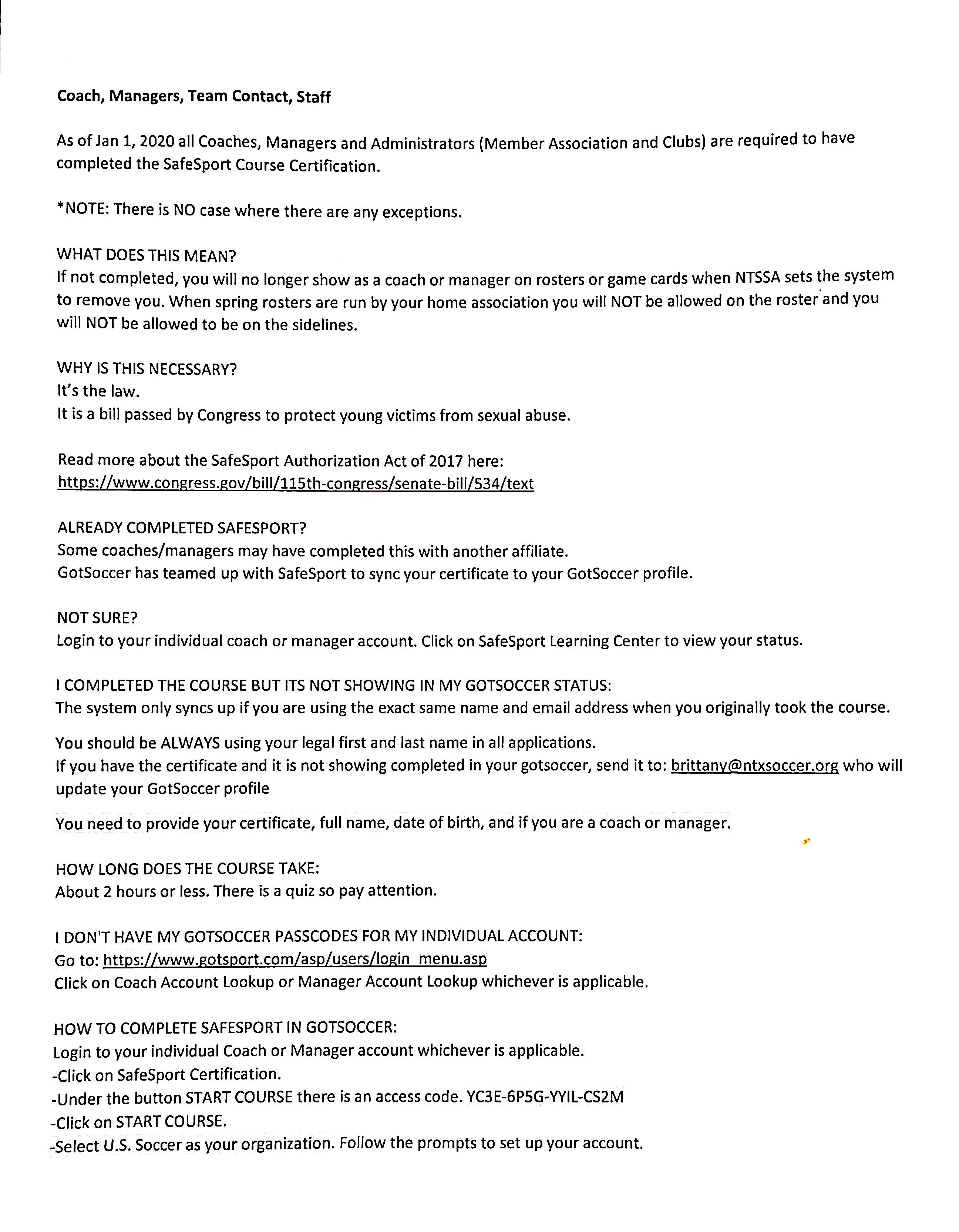 Coach, Assistant Coach, Manager, Board Member, Referee and Volunteer we are a member of a National Governing Body click on the SafeSport Training Course link to start.